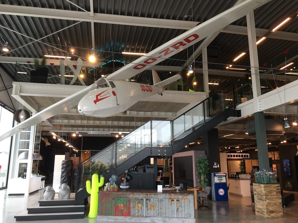 Sinds 2018 hangt aan het plafond van XL-Keukens in Hasselt de Avialsa-Scheibe A.60 Fauconnet OO-ZRD. Lees meer