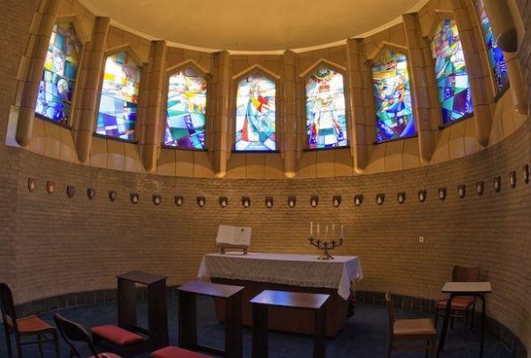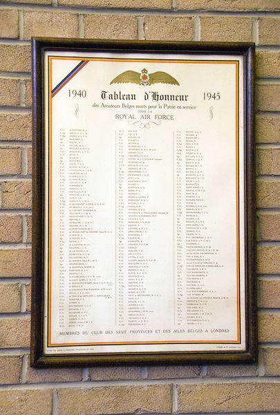 Aan de muur hangen de Squadron badges waarin Belgen actief waren. Op het altaar staat de “Roll of Honour”. Aan de muur hangt de “Table d’Honneur des Aviateurs morts pour la Patrie en Service de la RAF 40-45”.