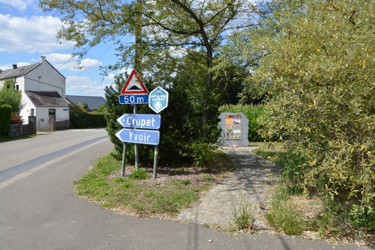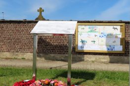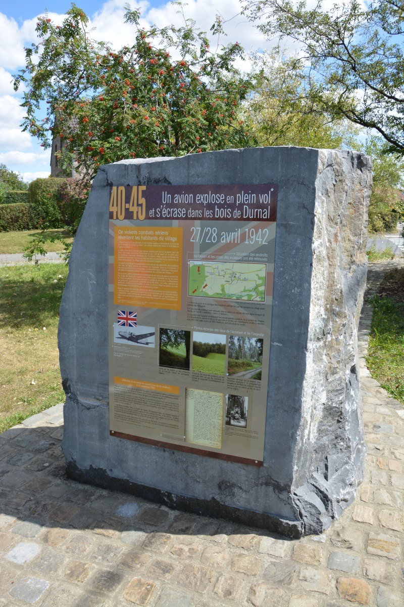 Attention : la plaque commémorative de l'équipage du Wellington se trouve au dos de la pierre, et sur le devant se trouve une plaque pour trois soldats français morts dans le village le 12 mai 1940.